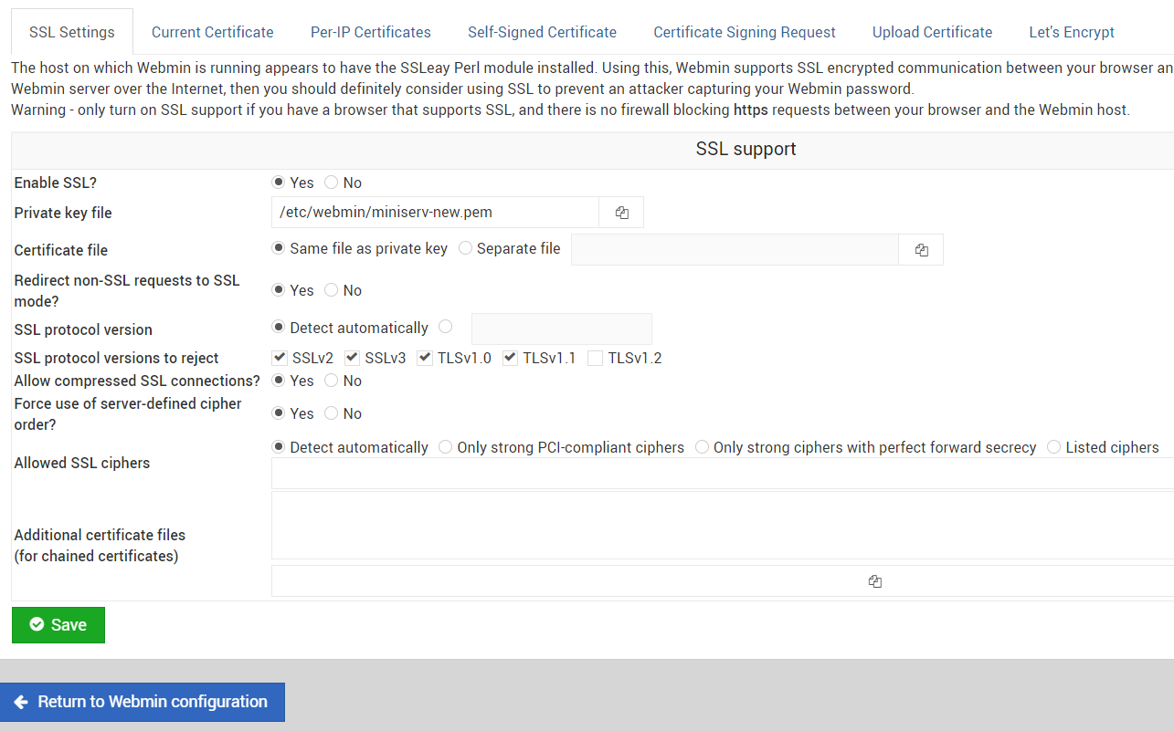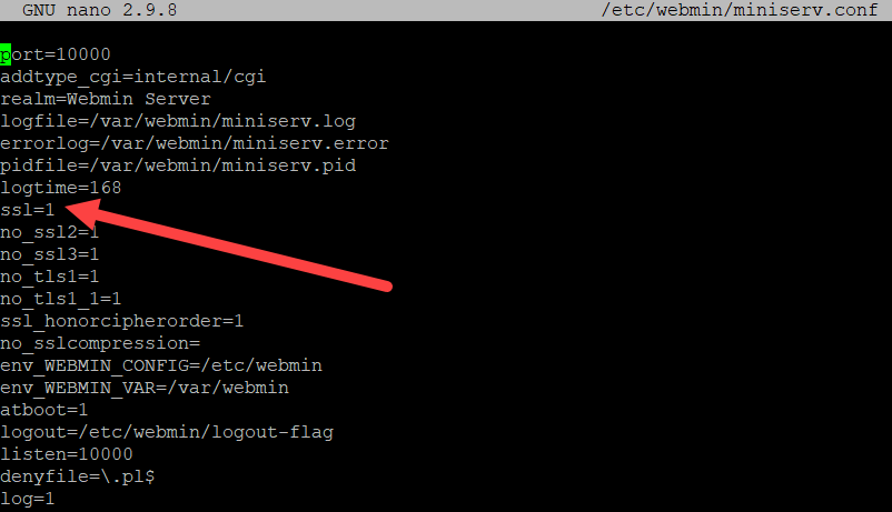 sudo nano /etc/webmin/miniserv.conf Look for the line that contains ssl=1