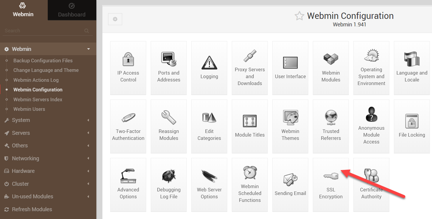 Then go to Webmin / Webmin Configuration and click on SSL encryption button: