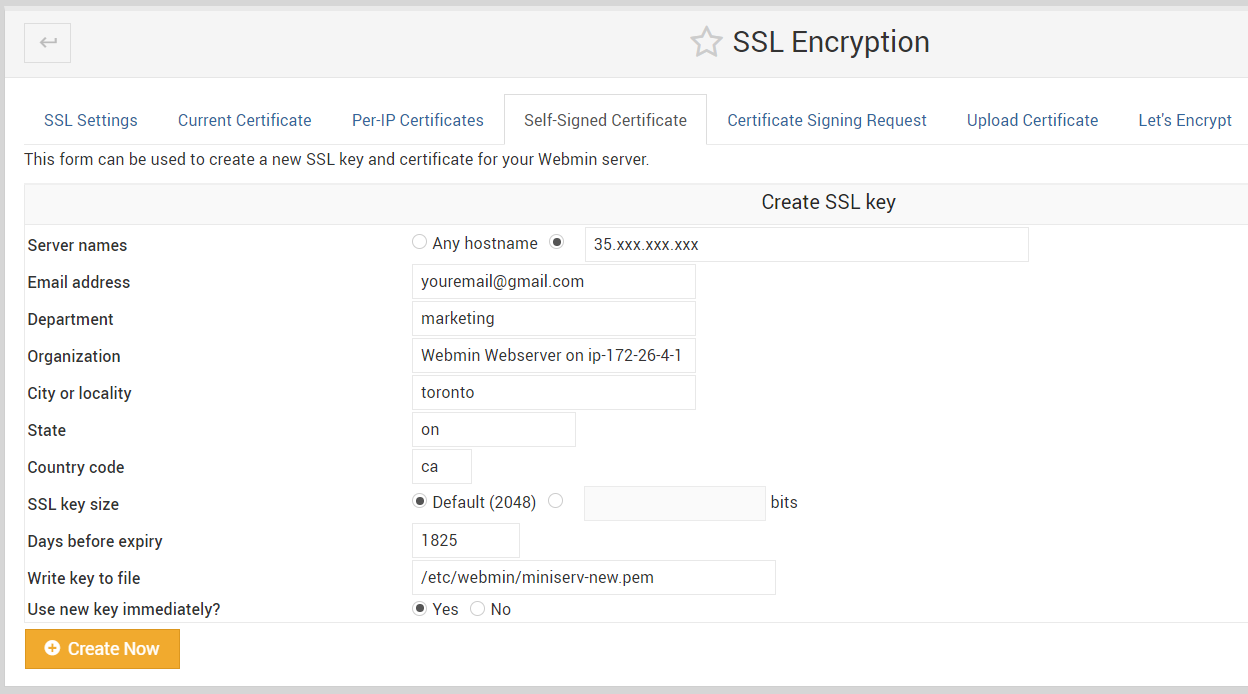 Once there, go to Self-Signed Certificate and create a new certificate, replace IP with the server's IP, put in your email, department, etc.